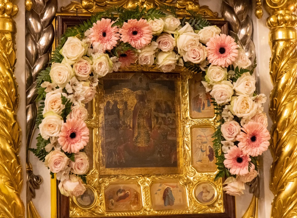 Этими словами въ церковной пѣсни описывается Покровъ Пресвятыя Богородицы. Счастливы были тѣ люди, которые удостоились за себя предъ Богомъ молитвеннаго предстательства Божія Матери и всѣхъ святыхъ. Подъ такимъ Божественнымъ покровомъ они находили духовную радость и блаженство, – находили миръ съ Богомъ, ближними и съ самими собою. Не меньшую радость можемъ находить и мы, вѣрующіе въ истиннаго Бога и Его Пречистую Матерь со всѣми святыми. Мы стоимъ теперь хотя не въ храмѣ Влахерискомъ, впрочемъ также во храмѣ, посвященномъ Господу Богу и Его Пречистой Матери. Какъ тогда, такъ и теперь по примѣру ихъ въ воскресный день, на всенощномъ бдѣніи, мы собрались сюда для общественной молитвы. Хотя и не видимъ мы предъ собою Пресвятой Богородицы, молящейся за насъ и покрывающей омофоромъ, какъ видѣли Ее блаженный Андрей съ ученикомъ своимъ Епифаніемъ; впрочемъ видимъ во храмѣ семъ день и ночь Ея чудотворную икону, избавляющую насъ отъ всѣхъ скорбей и напастей{1}. Она составляетъ радость и утѣшеніе для всѣхъ скорбящихъ. Она всегдашняя наша Молитвенница и Ходатайца среди всѣхъ нашихъ нуждъ и печалей.