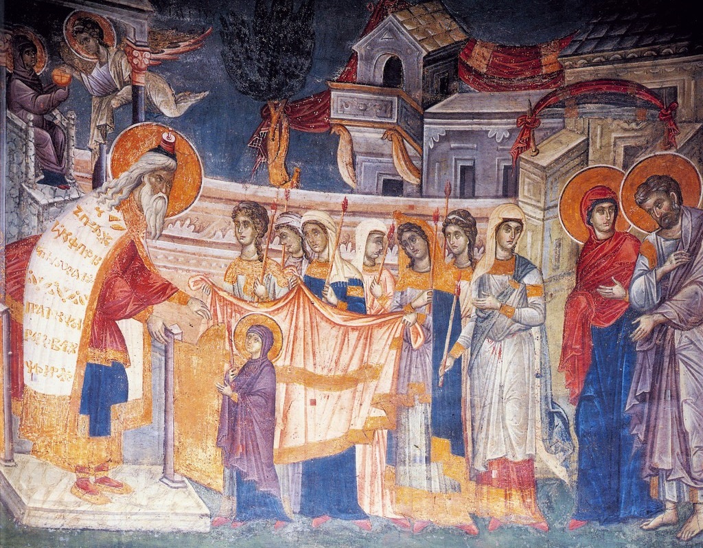 Пренепорочная Дѣва Марія по влеченію Духа Святаго съ трехлѣтняго возраста отдѣлена была отъ семейства и міра, отъ всѣхъ земныхъ заботъ и попеченій, и всецѣло предана была на служеніе Богу, дабы въ храмѣ Его, въ непрестанной молитвѣ, въ благоговѣйномъ изученіи слова Божія, въ трудахъ для пользы храма искать единаго на потребу.