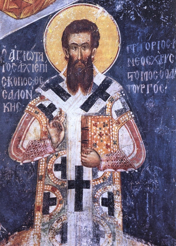 Свт. Григорий Палама. Роспись параклиса во имя св. Бессребреников мон-ря Ватопед на Афоне. Ок. 1371 г. Одно из ранних образов Святителя с надписью: «Преосвященный архиепископ Фессалоникийский Григорий и новый Златоустый, чудотворец».