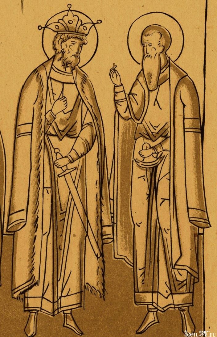 Свв. Михаил и Феодор Черниговские. Строгановский иконописный лицевой подлинник. 20 сентября (фрагмент). Русь. Кон. XVI - нач. XVII в. (издан в Москве в 1869 г.).