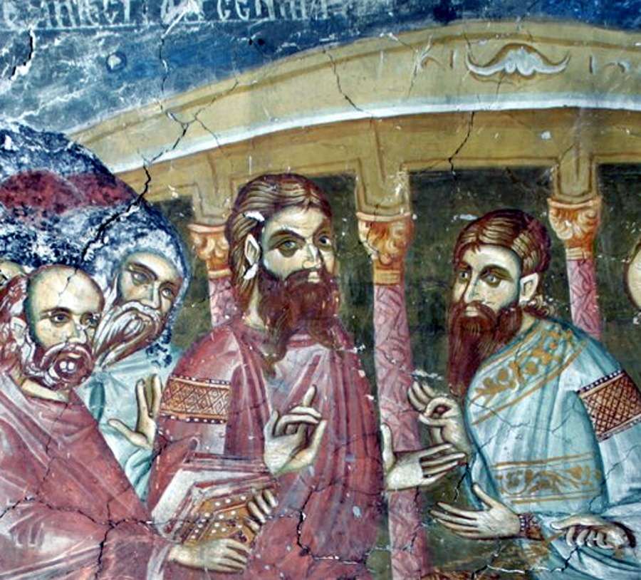 Певчие в сцене успения отпевания архиеп. Арсения. Роспись протесиса ц. Богородицы Одигитрии. Монастырь Печская Патриархия. Ок. 1335-1337 г.