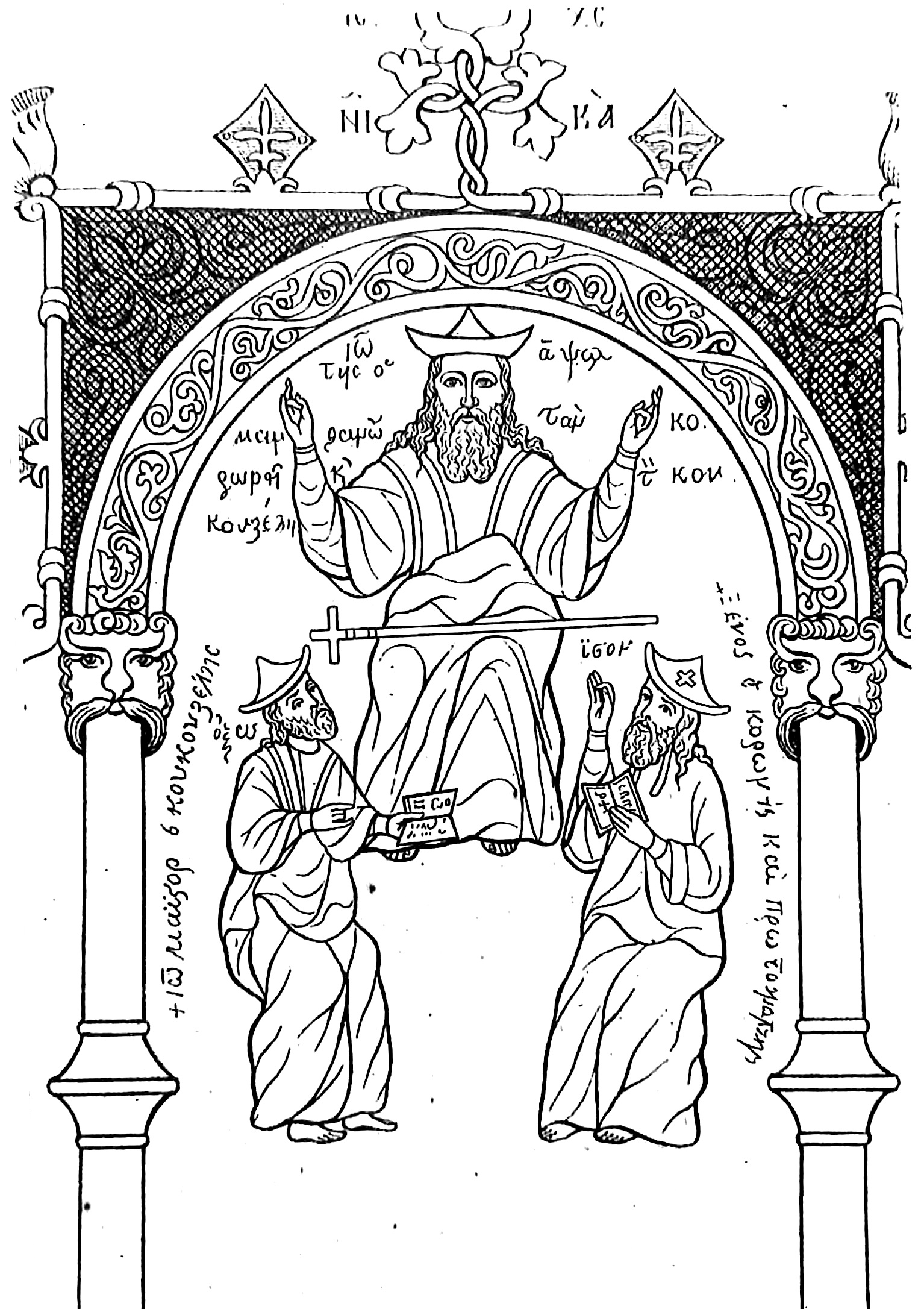 Протопсалт Иоанн Глика (+ок.1320) в окружении учеников – мелурги магистр прп. Иоанн Кукузель и протопсалт Ксен Коронис. Миниатюра из певч. рукописи Пападики 2-й пол. XIV в. из афонского мон-ря Кутлумуш (Ath. Cutl. 457. РНБ. Греч. Папка I. № 2).