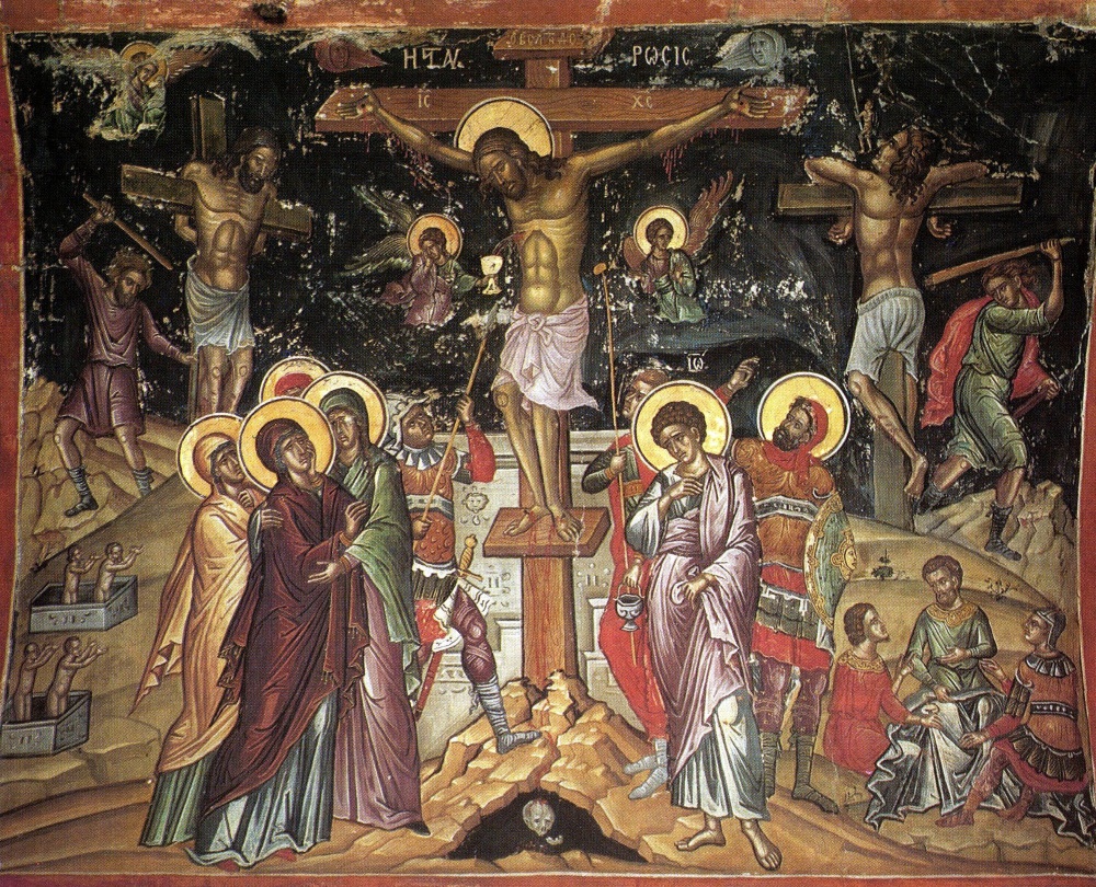 И приведоша Его на Голгоѳу мѣсто, еже есть сказаемо, лобное мѣсто. И съ Нимъ распяша два разбойника, единаго одесную и единаго ошуюю Его (Марка 15 гл. 22. 27).