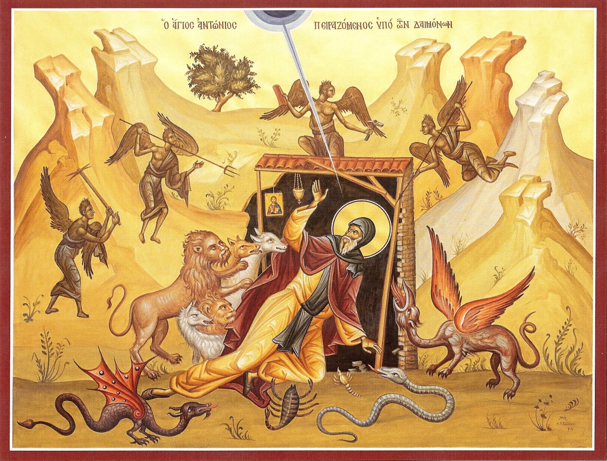 Еще большія разъясненія объ этомъ вліяніи діавола на человѣка мы находимъ въ аскетическихъ твореніяхъ. Первымъ письменнымъ памятникомъ, въ которомъ встрѣчаются такія разъясненія служитъ жизнь св. Антонія Великаго (†356 г.), составленіе которой приписывается св. Аѳанасію Александрійскому (†373). Она заслуживаетъ особеннаго вниманія, какъ прототипъ всѣхъ позднѣйшихъ разсказовъ о борьбѣ подвижниковъ со діаволомъ. Въ этомъ сочиненіи говорится прежде всего о томъ, что діаволъ возбуждалъ въ подвижникѣ нечистыя пожеланія. «Одинъ (т. е. діаволъ), влагалъ нечистые помыслы, другой (т. е. Антоній) отражалъ ихъ своими молитвами; одинъ приводилъ въ раздраженіе члены, другой, по-видимому, какъ бы стыдясь сего, ограждалъ тѣло вѣрою, молитвою и постомъ. Не ослабѣвалъ окаянный діаволъ, – ночью принималъ на себя женскій образъ, во всемъ подражалъ женщинѣ, только бы обольстить Антонія; Антоній же, помышляя о Христѣ и высоко цѣня дарованное Имъ благородство и разумность души, угашалъ угль его обольщенія». Когда на Антонія не оказало дѣйствія такое искушеніе, діаволъ приходитъ къ нему въ одну ночь со множествомъ демоновъ (въ пещеру) и наноситъ ему столько ударовъ, что тотъ отъ боли остается безгласно лежащимъ на землѣ; и, какъ самъ Антоній увѣрялъ, весьма жестоки были его страданія, и удары, нанесенные людьми, не могли бы, по словамъ его, причинить такой боли. Однако и это средство не помогло діаволу въ его дѣлѣ: Антоній не уходилъ изъ пещеры. Тогда діаволъ рѣшился подѣйствовать на подвижника страхомъ: «ночью – разсказываетъ св. Аѳанасій – демоны производятъ такой громъ, что, по-видимому, все то мѣсто пришло въ колебаніе и, какъ бы разоривъ четыре стѣны Антоніева жилища, вторгаются, преобразившись въ звѣрей и пресмыкающихся. Все мѣсто мгновенно наполнилось призраками львовъ, медвѣдей, леопардовъ, воловъ, змѣй, аспидовъ, скорпіоновъ, волковъ. Каждый изъ сихъ призраковъ дѣйствовалъ соотвѣтственно наружному своему виду. И всѣ сіи привидѣнія производятъ страшный шумъ, обнаруживаютъ лютую ярость. Антоній, поражаемый и уязвляемый ими, чувствуетъ ужасную тѣлесную боль, но тѣмъ паче, бодрствуя душою, лежитъ безъ трепета, и хотя стонетъ отъ тѣлесной боли, однако же, трезвясь умомъ и, какъ бы посмѣиваясь, говоритъ: «ежели есть у васъ сколько-нибудь силы, то достаточно было пройти и одному изъ васъ. Но поелику Господь отнялъ у васъ силу, – то пытаетесь устрашить множествомъ. Но и то служитъ признакомъ вашей немощи, что обращаетесь въ безсловесныхъ». Господь послѣ этого отогналъ отъ него демоновъ. Затѣмъ, демоны цѣлыми толпами являлись къ оградѣ жилища Антонія, стучались къ нему и жалобно вопили: «удались отъ нашихъ мѣстъ; что тебѣ въ этой пустынѣ? не перенесешь нашихъ козней».