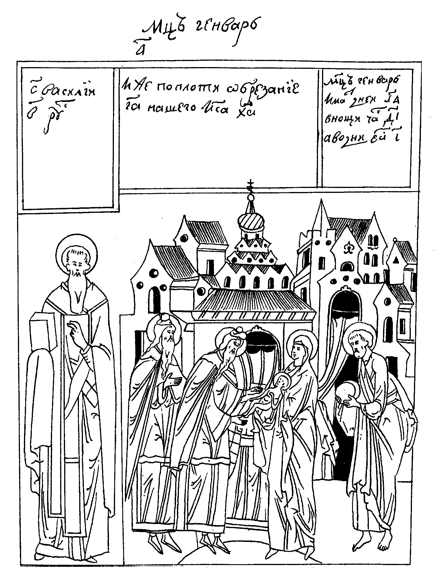 Въ лицевомъ подлинникѣ изъ собранія С. Т. Большакова подъ 1 января изображено «Иже по плоти обрезаніе г҃а нашего и҃са х҃а». Представлены палаты – церковь съ восьмиконечнымъ крестомъ на главѣ. Внутри храма, на полукругломъ возвышеніи (амвонъ?) стоитъ Пресвятая Дѣва, держащая Младенца Спасителя на рукахъ, и ветхозавѣтный священникъ, готовый взять Богомладенца для совершенія надъ нимъ обрѣзанія. За этимъ священникомъ стоитъ другой съ простертою десницей, сзади же Богоматери – праведный Іосифъ съ круглымъ предметомъ въ рукахъ (см. рисунокъ).