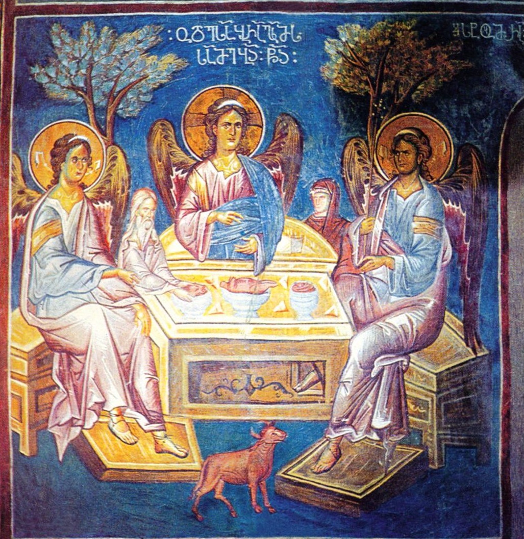 «Гостеприимство Авраама». Роспись в среднем ярусе центральной апсиды церкви Успения Богородицы в с. Лыхны, Абхазия. XIV в. На фреске надпись выполненная древнейшим видом грузинского письма – Асомтаврули.