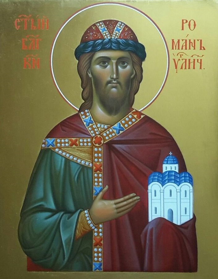 Измла́да яви́лся еси́, Богому́дре,/ кня́же Рома́не всеблаже́нне,/ Боже́ственный сосу́дъ избра́нъ Бо́гови,/ и ны́нѣ то́чиши намъ мно́гая исцѣле́нія,/ и вся неду́ги потопля́еши,/ и спаси́ градъ свой У́глечъ,/ и всѣ́хъ вѣ́рныхъ сохраня́й отъ неви́димыхъ и ви́димыхъ врагъ,/ вѣ́рою, мо́лимъ, блаже́нне кня́же Рома́не,/ моли́ Христа́ Бо́га спасти́ся душа́мъ на́шимъ.