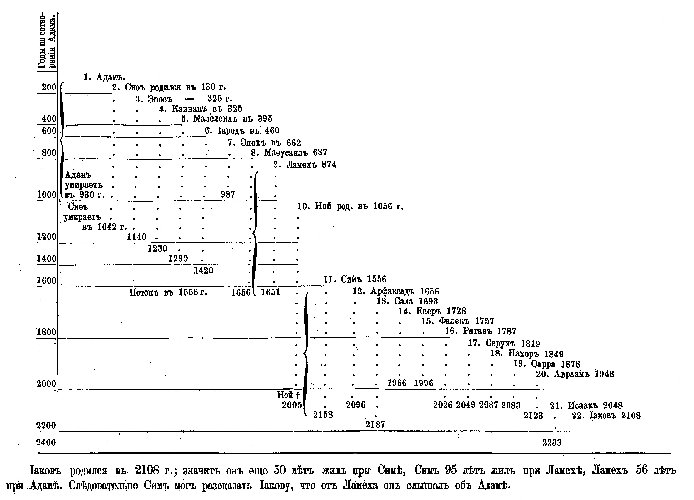 Часто бываетъ интересно знать, какимъ образомъ Моисей могъ получить столь точныя свѣдѣнія объ исторіи человѣчества, начиная съ Адама. Лишь очень небольшое число читающихъ Библію способны дать себѣ отчетъ въ томъ, кто изъ патріарховъ жилъ еще одновременно. А между тѣмъ оказывается, что исторія человѣчества отъ Адама до Іакова могла быть передана лишь тремя свидѣтелями; эти свидѣтели – Іаковъ, Ламехъ и Адамъ. Въ тѣ древнѣйшія времена существованія человѣческаго рода память была болѣе развита, чѣмъ у нашего поколѣнія, ослабляющаго ее надеждою на возможность всегда прочитать и справиться; изслѣдователи исторіи востока еще и въ наши дни восхищаются силою и точностью памяти не цивилизованныхъ сыновъ пустыни. Въ передачѣ исторіи творенія міра, конечно, память людей имѣла меньшее значеніе. Относительно этого мы должны будемъ принять, что исторія та была открыта Адаму Богомъ. Но слѣдующее за симъ сопоставленіе одновременно жившихъ, начиная съ Адама и кончая Авраамомъ, праотцевъ можетъ быть интереснымъ и поучительнымъ для всѣхъ читателей свящ. Писанія.