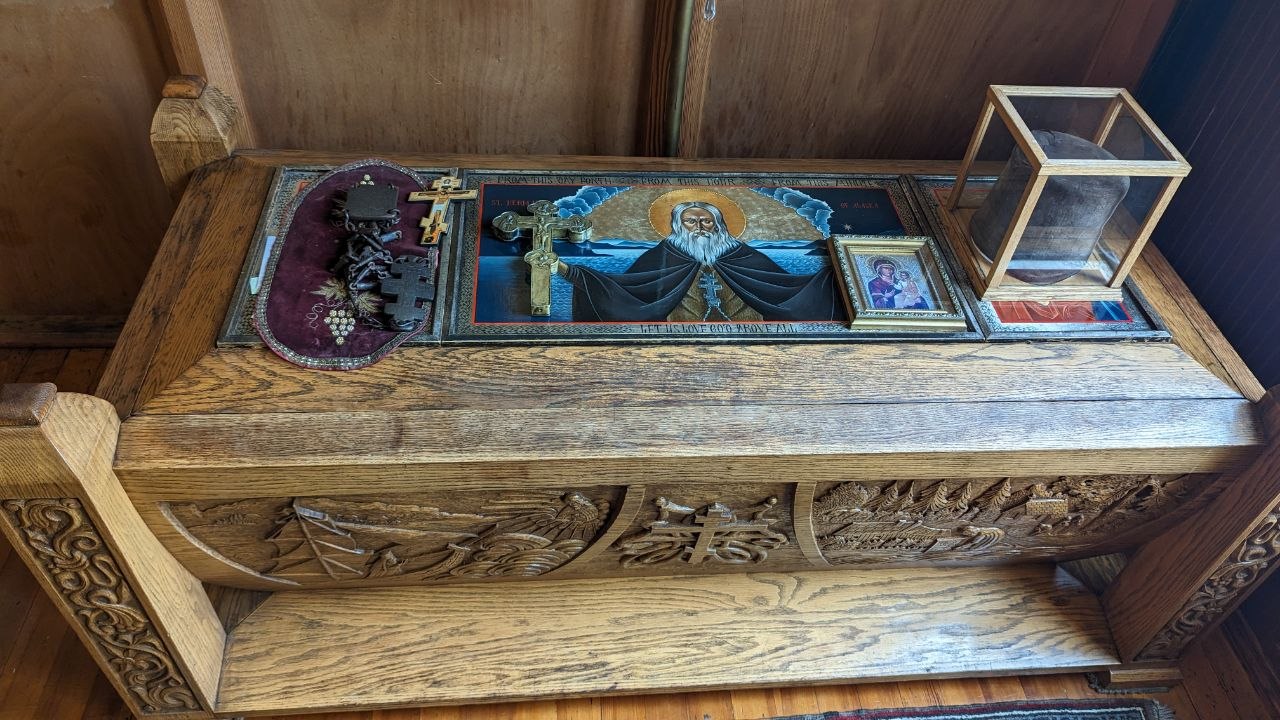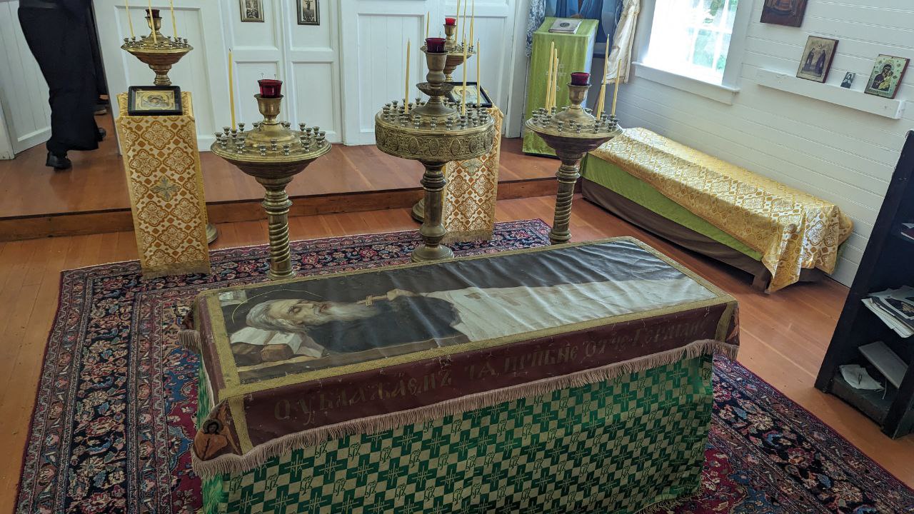 Рака с мощами преп. Германа Аляскинского на к-рую были возложены принадлежавшие святому камилавка и железный крест с параманом. Собор Воскресения Христова на о-ве Кадьяк.