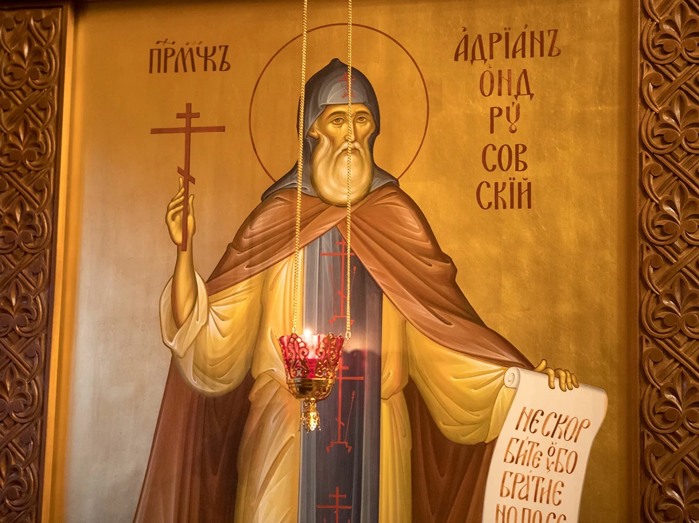 О преподо́бне о́тче Адріа́не, уго́дниче Бо́жій, пусты́нный жи́телю, послу́шниче Христо́въ! Ты́ убіе́ніе отъ нечести́выхъ человѣ́къ по науще́нію вра́жію претерпѣ́лъ еси́, но Го́сподь Бо́гъ десна́го стоя́нія Своего́ со святы́ми тя́ сподо́би. Сего́ ра́ди къ ра́цѣ честны́хъ моще́й твои́хъ припа́даемъ и мо́лимъ тя́ усе́рдно: бу́ди моли́твенникъ къ Го́споду Бо́гу о на́съ грѣ́шныхъ, святы́ми твои́ми моли́твами сохрани́ на́съ отъ вся́каго зла́, огня́, гла́да, пото́па и отъ вся́кія болѣ́зни и внеза́пныя сме́рти: и умоли́ Го́спода Бо́га дарова́ти на́мъ оставле́ніе грѣхо́въ, десна́го же стоя́нія и на́съ сподо́бити, да непреста́нно прославля́емъ Пресвяту́ю Троицу, Отца́ и Сына и Свята́го Духа, во вѣ́ки вѣко́въ.