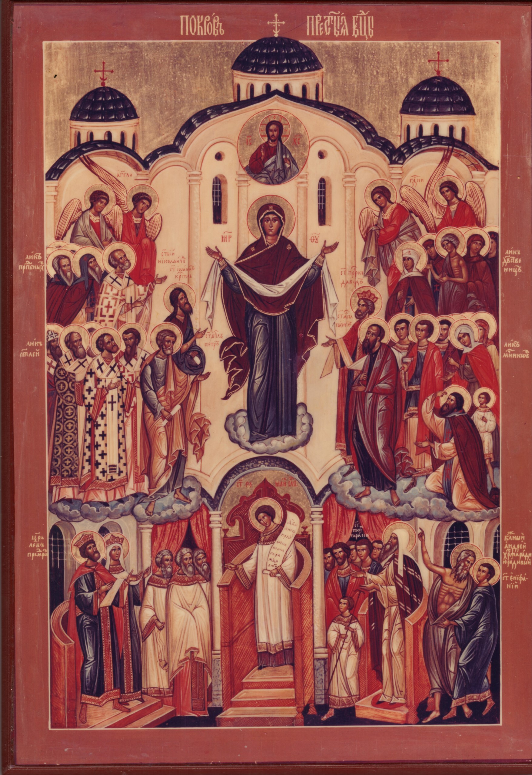 Современная икона Покрова Богородицы, писана по русскому изводу. Иконописная мастерская Свято-Преображенского монастыря в Бостоне, штат Массачусетс, США. 1961 г.